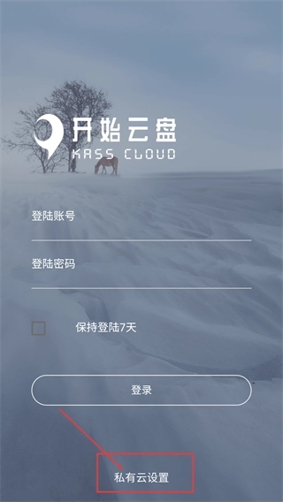 1、进入【开始云盘-KASS-CLOUD】登录界面后,需要填写【登录账号】和【登录密码】,接着点击【私有云设置】来配置私有云相关信息。