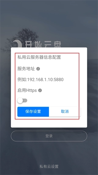 2、点击【私有云设置】后,在弹出的【私用云服务器信息配置】窗口中填写【服务地址】,可根据需要勾选启用【Https】选项,然后点击【保存设置】按钮。