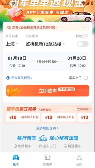 铁行租车推出灵活的服务体系,针对用户多样化的出行需求,不仅提供异地还车、上门送取车等便捷服务,还设有丰富的价格优惠活动与保险套餐供用户自主挑选。