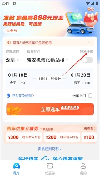 然后点击是否异地还车与送车上门,按需求选择哦!