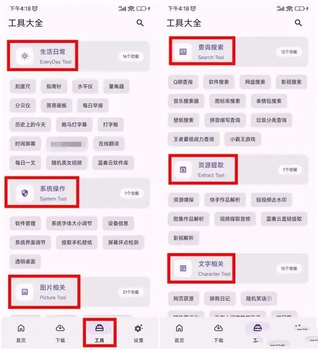 点击“工具”选项,就能看到更多的小工具软件,涵盖生活日常、系统操作、图片相关、查询搜索、文字相关等多个类别,每个类别下都有大量实用的小功能。