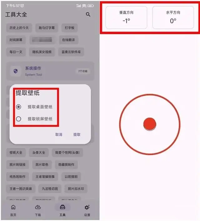 工具大全里的那些小功能同样很实用,像提取手机壁纸、平衡仪之类的都挺好用。
