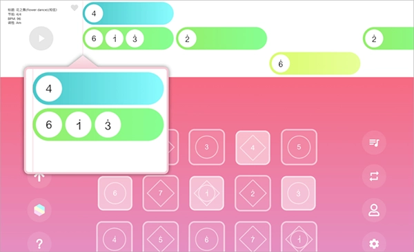 点击歌曲标题后稍作等待,乐谱就会加载到练习界面中。乐谱共分为三行,其中第一行与键盘的第一行按钮相对应。
