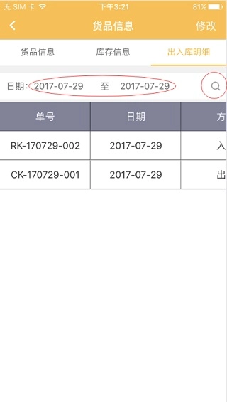 查看货品相关的出入库明细时,需先选定日期范围,再点击搜索按钮就能查看。详细明细可通过左右滑动来浏览。