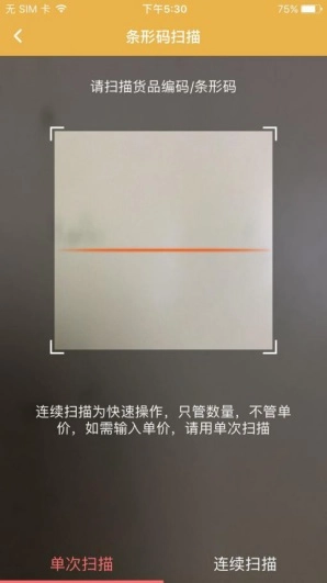 带有二维码或条形码的货品,可直接通过扫描条形码或二维码来添加。该功能支持单次扫描和多次扫描两种模式,需要注意的是,多次扫描属于快捷操作方式,此操作仅统计货品数量,不涉及单价设置;若需要输入货品单价,则应选择使用单次扫描功能。
