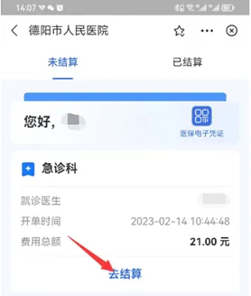 进入待支付界面后,找到对应的就诊订单并点击结算按钮以完成医保结算流程;若为首次操作,系统会提示进行医保电子凭证的注册与授权。