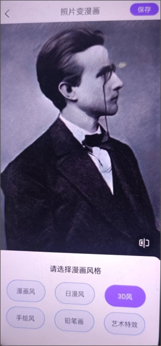 从相册里挑一张图片,接着选定漫画类的呈现风格,调整完成后点击界面右上角的保存按键就行。