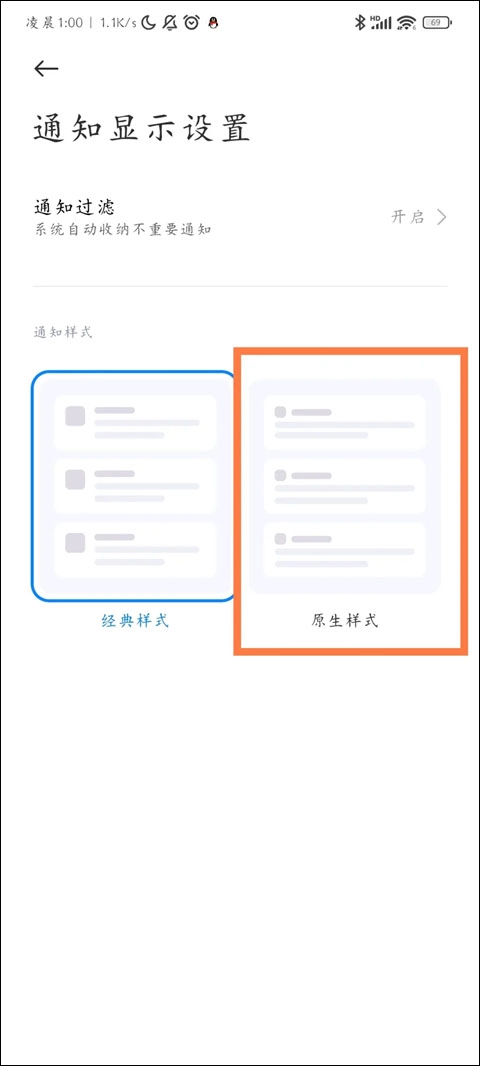 回到设置将通知显示设置改成原生样式。