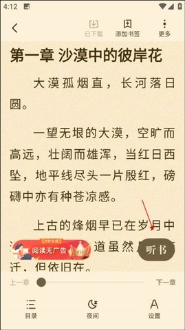 2、进入听书界面界面,拥有定时、语速、章节、朗读音、边听边读等功能