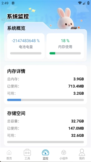 3.点击页面下方的“监控”选项,就能查看系统概览、内存详情、存储空间等功能模块。