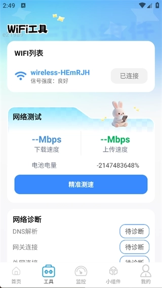 2.点击页面下方的“工具”选项,就能看到WiFi列表、网络测试、网络诊断等功能。
