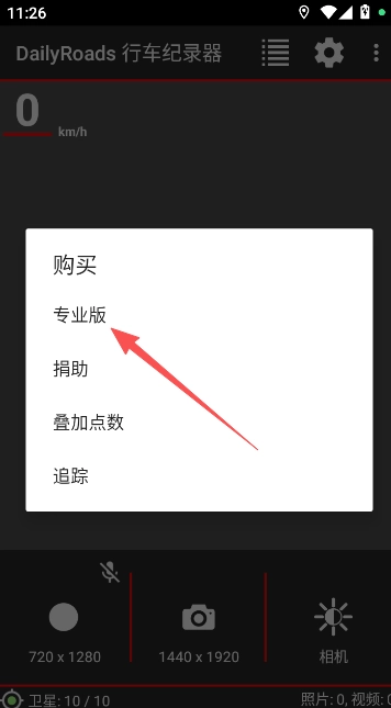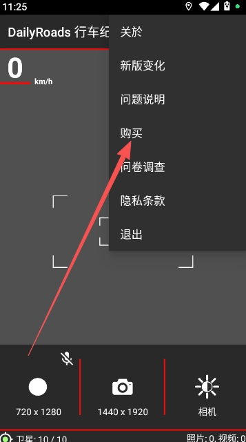 点击DailyROads行车纪录画面右上方的图标,从中找到购买选项。