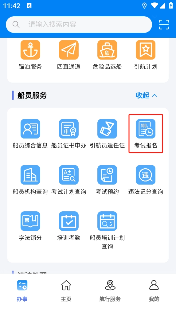 在船员服务方面,我们向船员提供综合信息查询、违法记分查询、机构信息浏览、考试计划查询等服务,还承办证书申办、考试预约等业务,为船员给予全方位的支持。