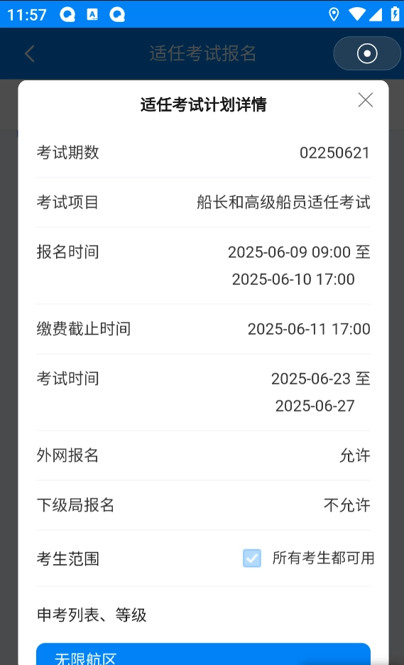 点击“适任考试”进入详情页面,这里包含“考试报名”“考试申报查询”“考试缴费”“考试通知书”“考试成绩查询”五项功能。有意报名的考生可点击“考试报名”,找到对应的报名期数,船员信息将自动填充至详情页面。