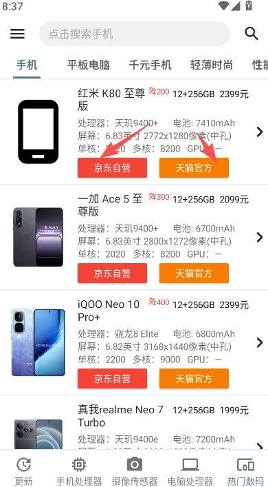 6、热门数码板块,为您呈现京东自营与天猫的最新价格对比,价格涨跌趋势清晰直观,一目了然。