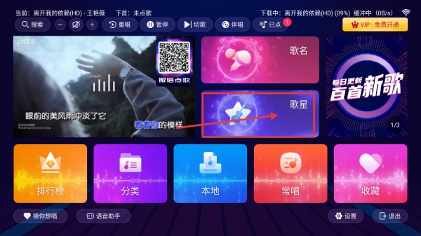 打开K歌应用,点击歌星按钮,进入歌星分类页面查找歌手。