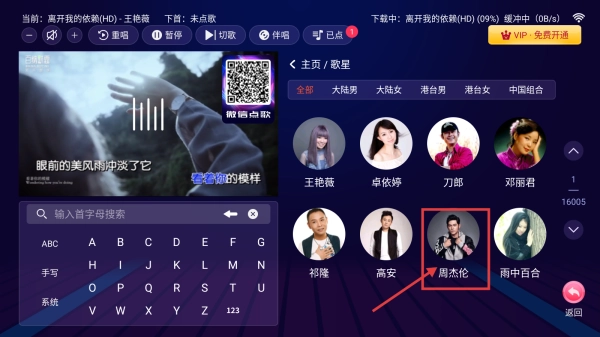 在歌星页面,找到周杰伦的歌手头像并点击,就能进入他的歌曲列表页面。