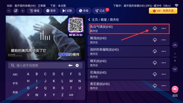 在周杰伦的歌曲列表中,找到并点击《告白气球》BHD版本的歌曲,以便进行演唱或播放操作。