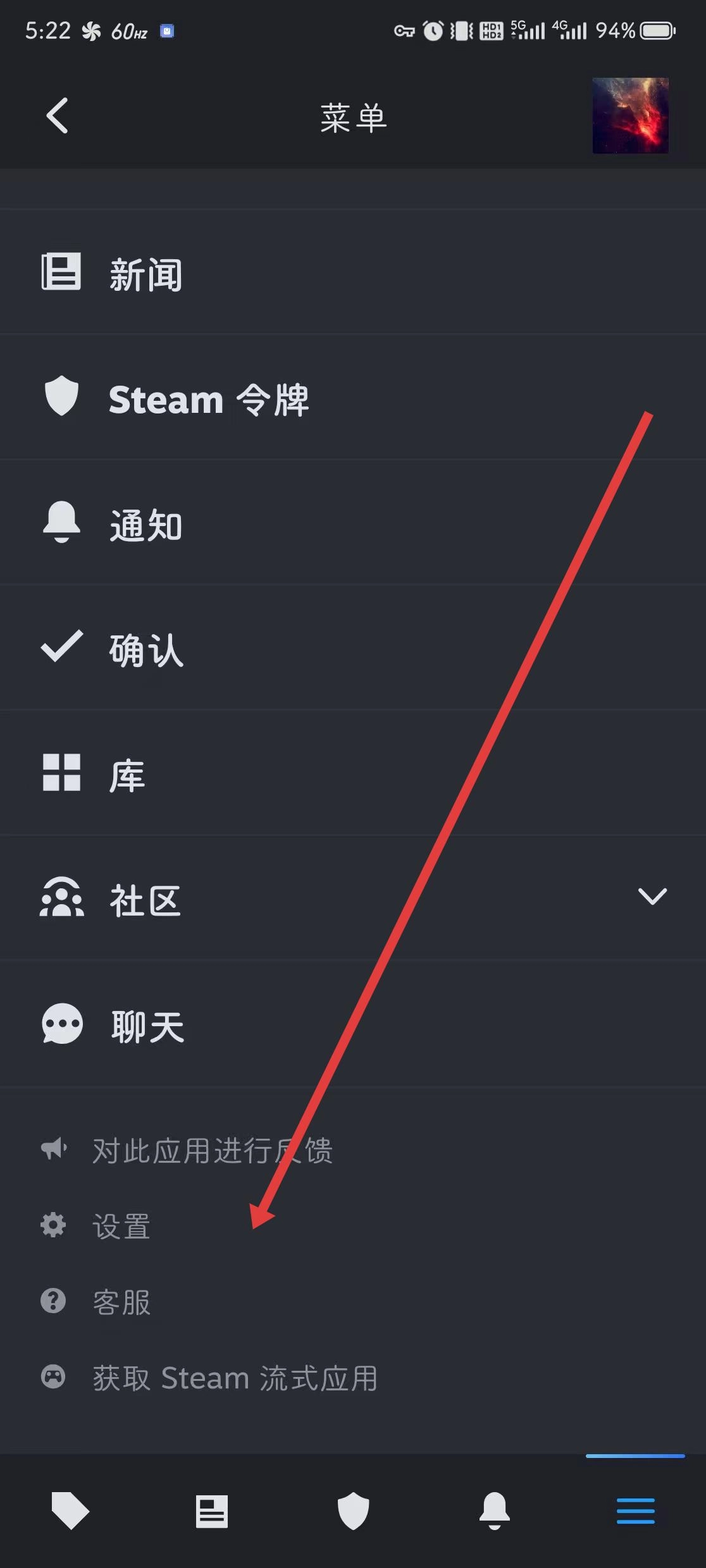 1. 开启Steam手机应用程序,轻点底部右侧的菜单栏图标,使菜单列表展开,进而进入设置界面。
