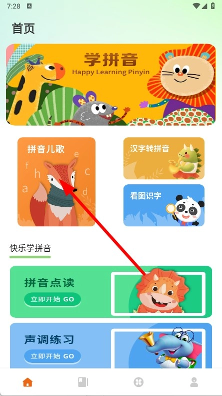打开全科启蒙,点击拼音儿歌板块,进入拼音儿歌页面。