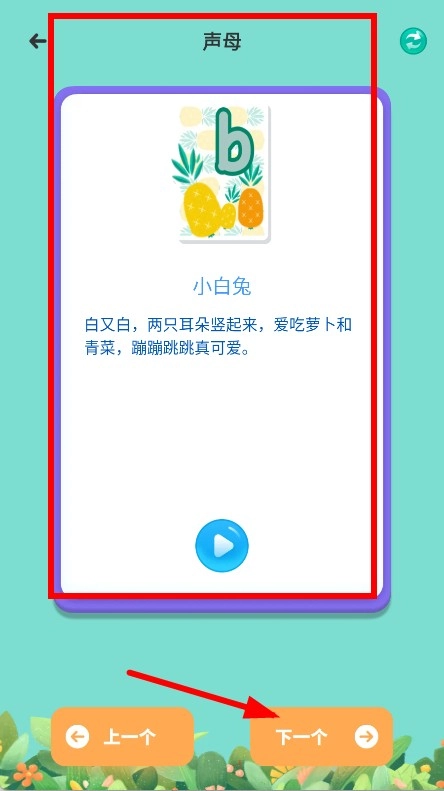 查看声母b的相关内容后,点击下一个按钮,就能继续学习其他声母了。
