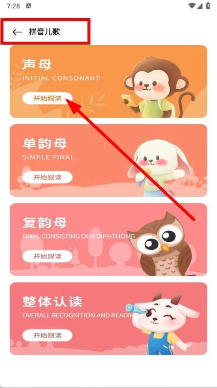 在拼音儿歌页面,选择声母分类下的开始跟读按钮。
