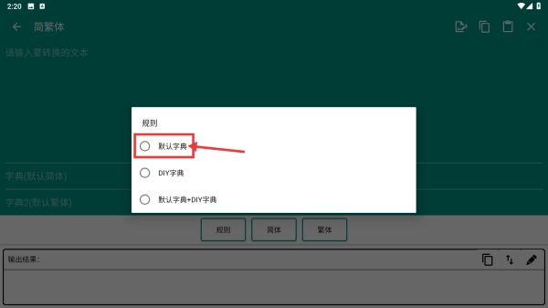 在简繁体转换界面的规则弹窗里,选择默认字典选项,以此确认转换规则。