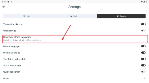 在设置页面,点击“Download-offline-translation”选项,即可进入“Offline-translation”界面。