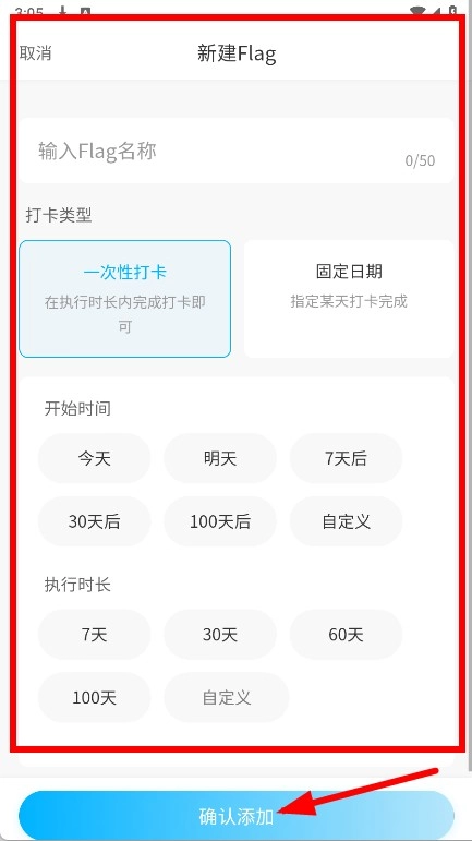 填写Flag名称,选定打卡类型,设定开始时间和执行时长,全部设置完成后点击确认添加按钮。