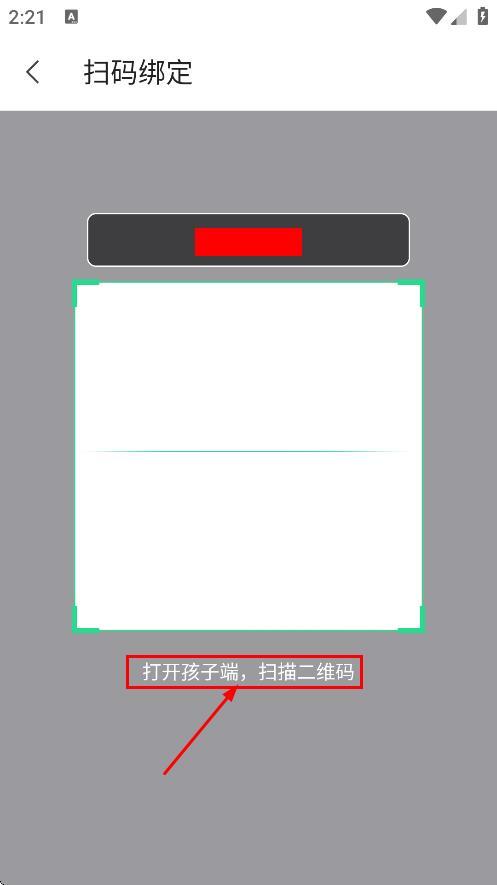 4、进入扫码绑定页面后,在孩子端打开扫码功能,扫描相应二维码,从而完成设备绑定。