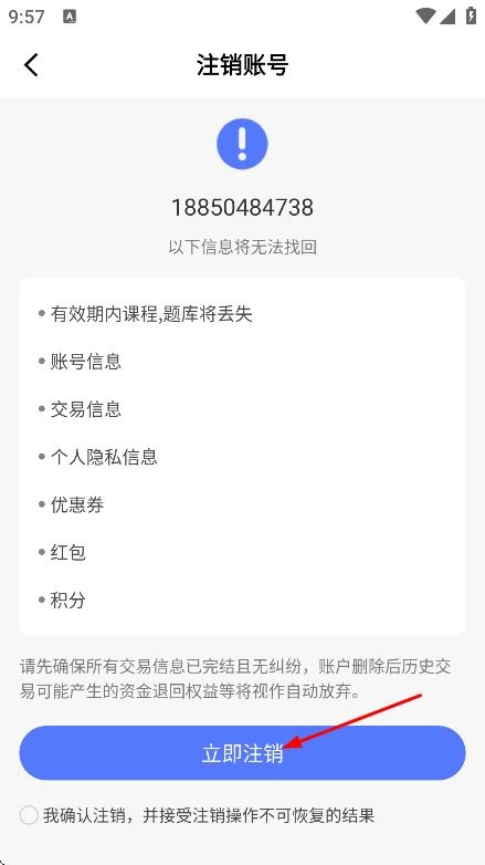 4、进入注销账号确认页面后,点击“立即注销”按钮,即可完成账号注销操作。