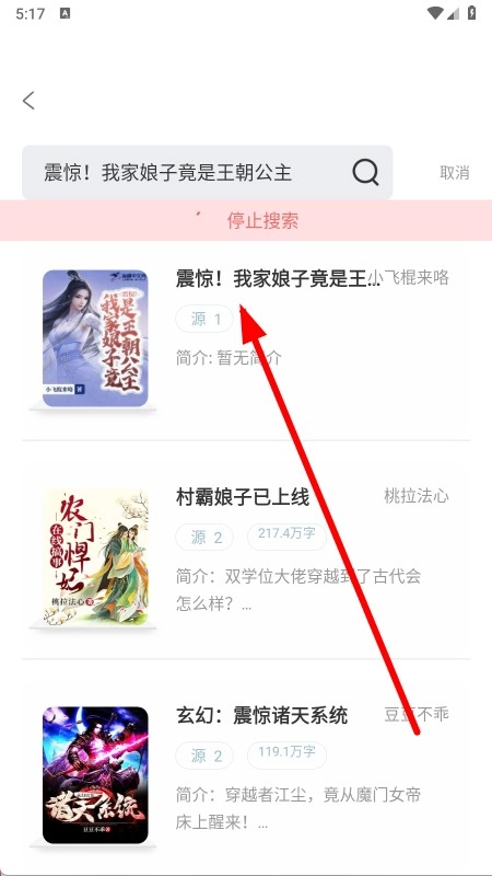 2、进入小说搜索结果页面,点击对应小说条目。