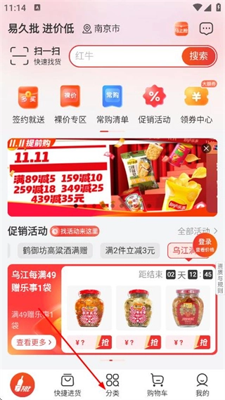 在易久批首页,点击底部的“分类”选项,即可进入商品分类页面。