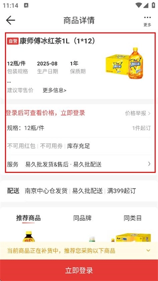 在商品分类页面,点击康师傅冰红茶1L,进入商品详情页面。