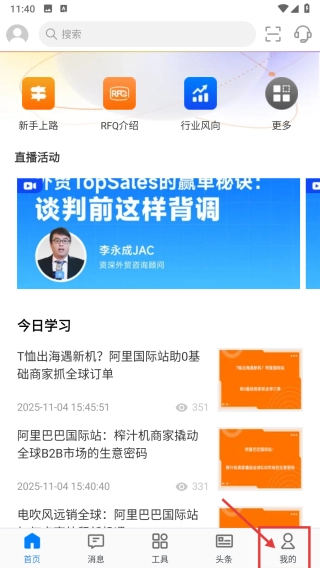 打开外贸学习应用,点击底部导航栏的“我的”选项,即可进入个人中心页面。
