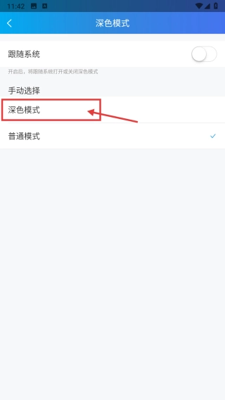 在深色模式页面中,点击深色模式选项,即可完成界面风格的切换。