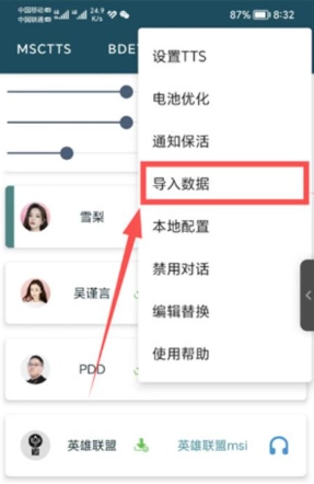 2. 开启MultiTTS语音包,轻点右上角的三竖点,接着点击导入数据。