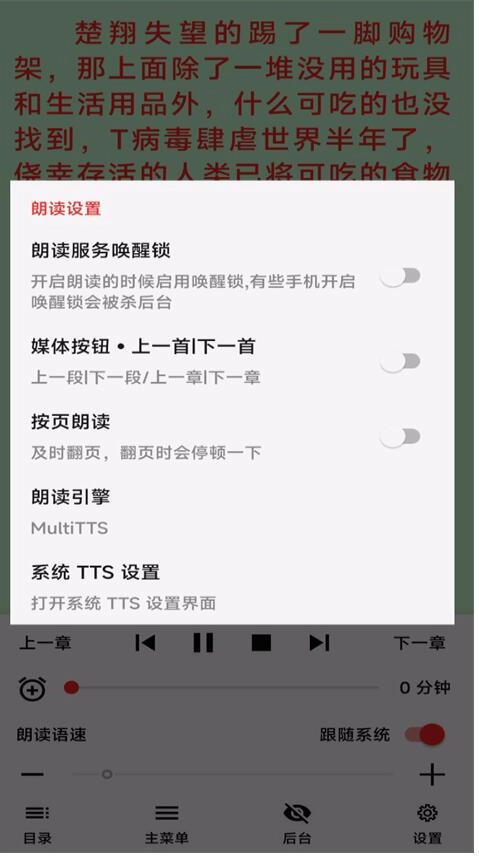 7、开启看小说的软件,进入到阅读界面,于朗读设置里挑选朗读引擎(或者系统TTS设置)
