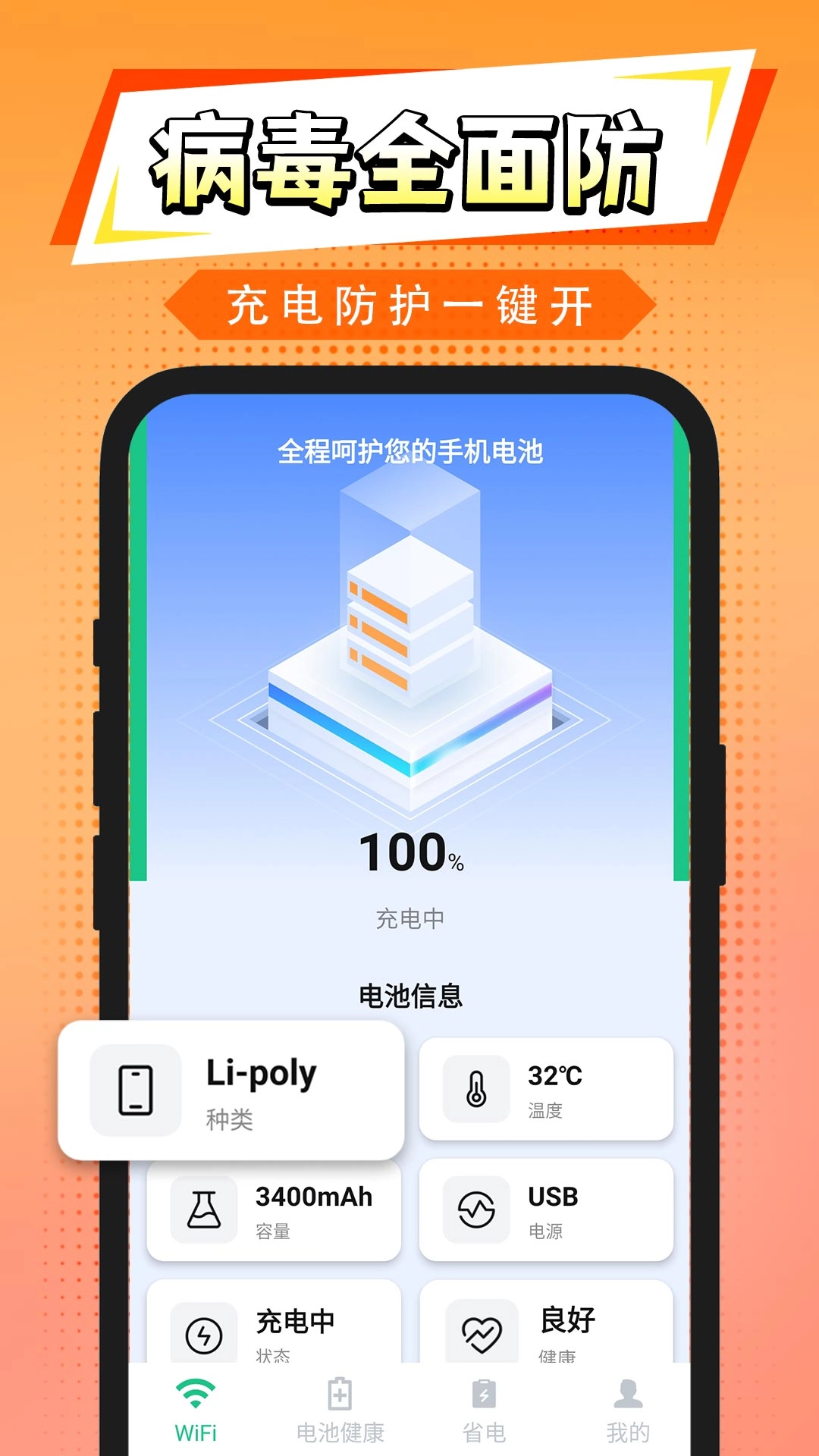 【电池健康跟踪】 监控电池状态、健康等数据,专业评分 + 护理知识,延长电池寿命; 【一键省电】 一键优化耗电应用,提高使用时长,低电量也能持久在线;