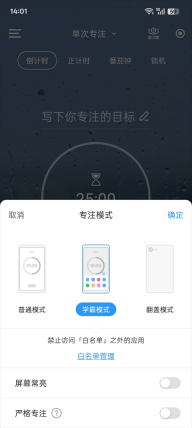 四种专注类型中,除锁机外,每种类型下均包含4种专注模式,分别为:常亮模式、学霸模式、翻盖模式以及严格专注模式。