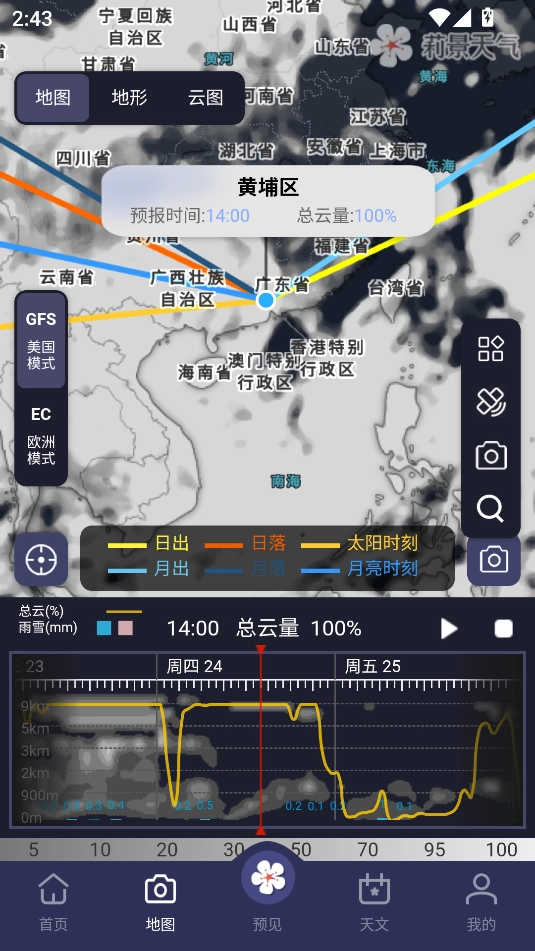 2、地图界面中,能查看不同时刻的云图、云量信息