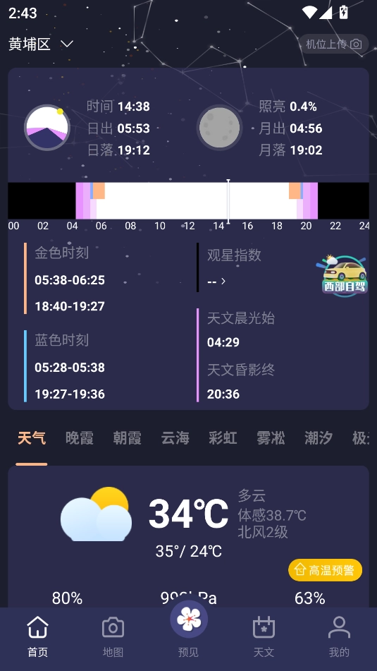 首页不仅展示了日出日落、月出月落的具体时刻,还提供了丰富的天气信息。