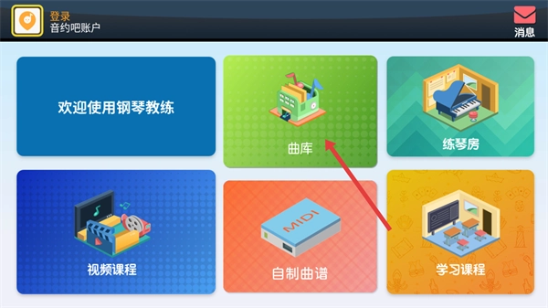 打开钢琴教练应用后,点击界面上的【曲库】按钮,即可进入曲库页面。在该页面中,你可以浏览到各种各样的钢琴曲目资源,从而为接下来的练琴选曲环节做好准备。