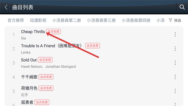 3、进入曲目列表后,挑选像【Cheap-Thrills】这类会员免费曲目,点击就能查看该曲的详细练琴章节。