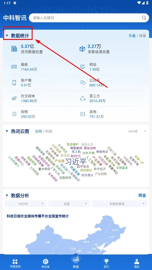 1、进入【数据】页面后,能够查看【资讯数据总量】与【采集信源总量】,同时可使用热词云图及传播统计分析功能。