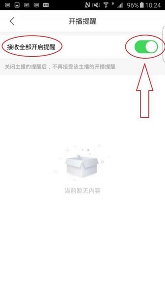 3、进入开播提醒页面,点击“接受全部开启提醒”后的按钮,待按钮变为绿色,即完成操作。