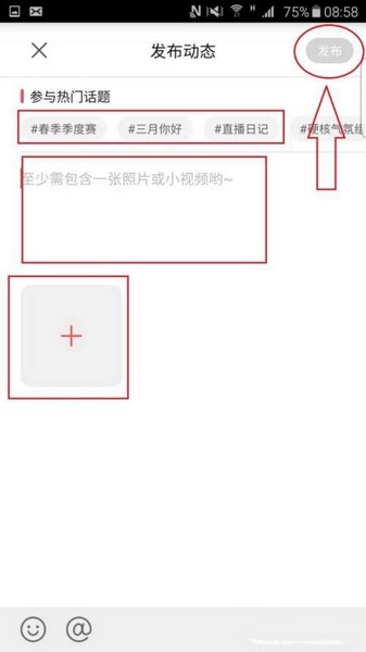 3、进入发布动态页面后,依次插入话题、输入正文,插入图片等内容后,点击右上角的“发布”。 (原句“插没脾入图片常各宿等”表述有误,推测修改如上)