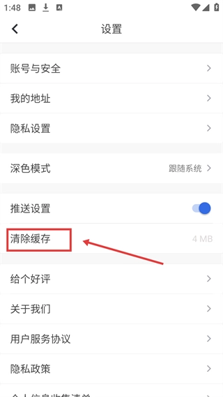 3、进入【设置】页面,找到【清除缓存】选项。